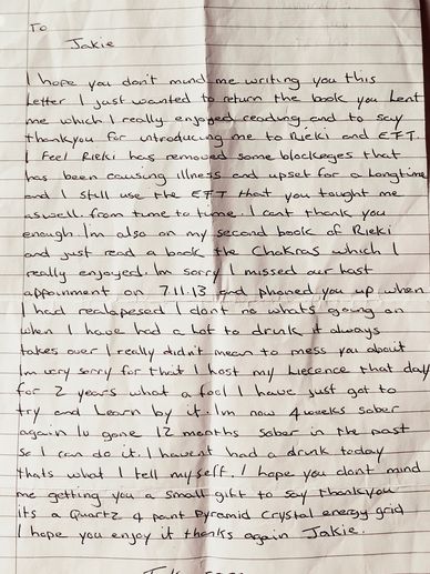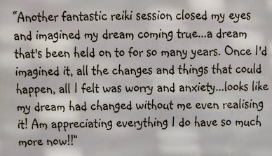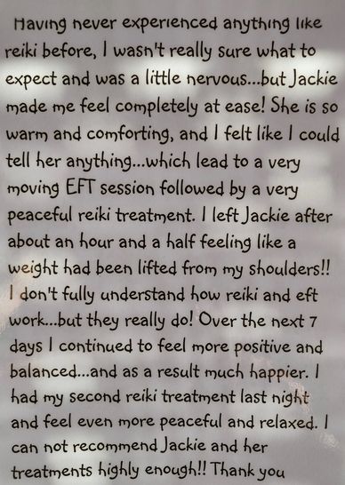 She is so warm and comforting, and I felt like I could tell her anything...which lead to a very moving EFT session followed by a very peaceful reiki treatment. I left Jackie after about an hour and a half feeling like a weight had been lifted from my shoulders!! I don't fully understand how reiki and eft work...but they really do! Over the next 7 days I continued to feel more positive and balanced...and as a result much happier. I had my second reiki treatment last night and feel even more peaceful and relaxed. I can not recommend Jackie and her treatments highly enough!! Thank you :-)"